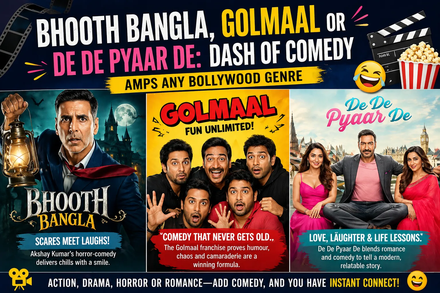 From the laughter-driven chaos of Golmaal to the romantic humor of De De Pyaar De and the eerie yet entertaining world of Bhooth Bangla, one thing is clear: comedy is the heartbeat of Bollywood.