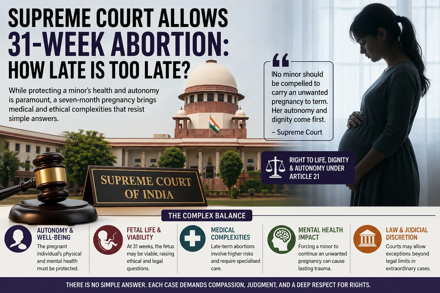 In April 2026, the Supreme Court permitted a 15-year-old girl to terminate her pregnancy at 31 weeks—well beyond the usual legal limit. The Court emphasised that forcing her to continue the pregnancy would violate her fundamental rights, including dignity, privacy, and personal liberty under Article 21 of the Constitution.